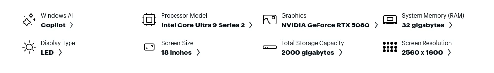 المعالج: معالج Intel Core Ultra 9 Series 2 (275HX)، 24 نواة (8 أداء + 16 كفاءة)، سرعة أساسية 2.7 جيجاهرتز وتعزيز حتى 5.1 جيجاهرتز، مع وحدة معالجة عصبية (NPU) لأداء ذكاء اصطناعي يصل إلى 13 تريليون عملية في الثانية.