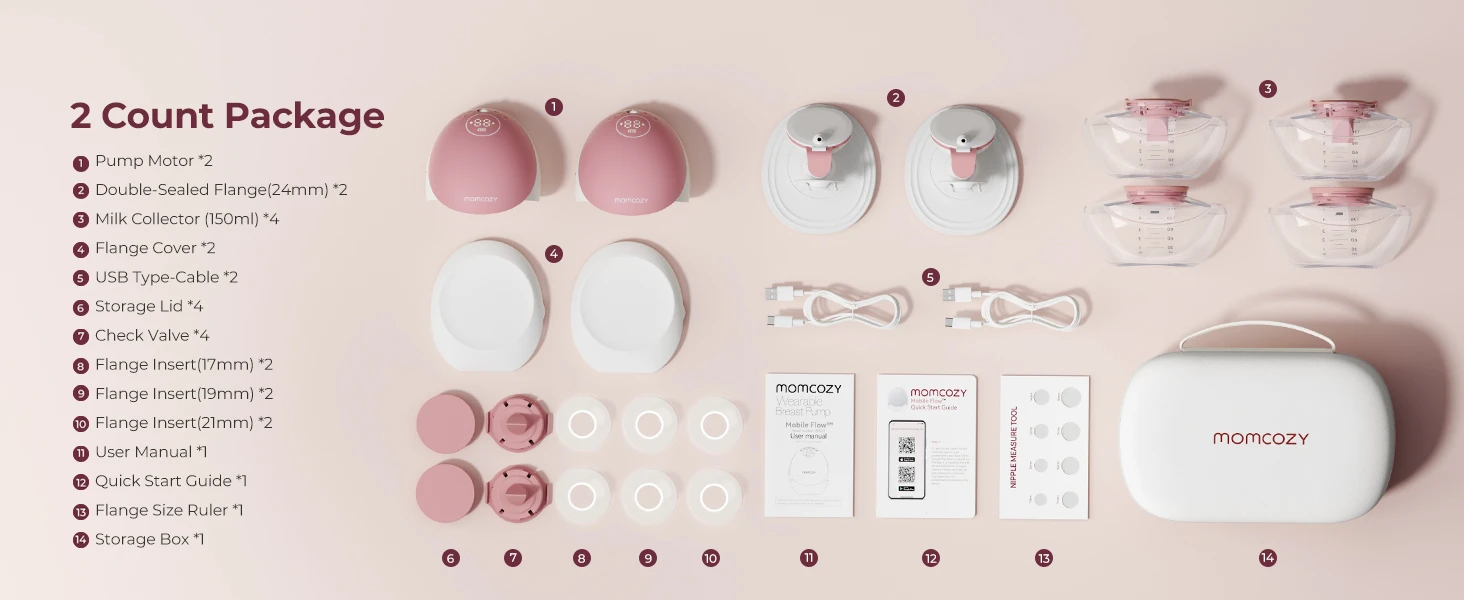 مناسبة لمعظم الأمهات: تأتي المضخة بأربعة أحجام للفلكنج (17/19/21/24 مم) مع حقيبة تخزين فاخرة. شحنة واحدة تكفي ليوم كامل. أجزاء سهلة التنظيف (4 فقط).