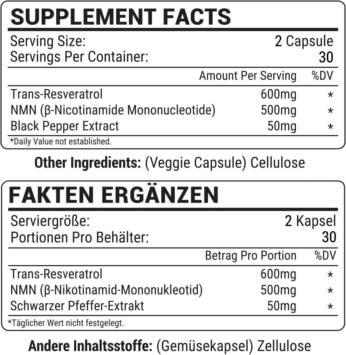 لماذا يُضاف مستخلص الفلفل الأسود إلى التركيبة؟ يُحسّن مستخلص الفلفل الأسود امتصاص NMN والريسفيراترول، مما يضمن استفادة جسمك الكاملة من العناصر الغذائية. يُحسّن طول العمر.