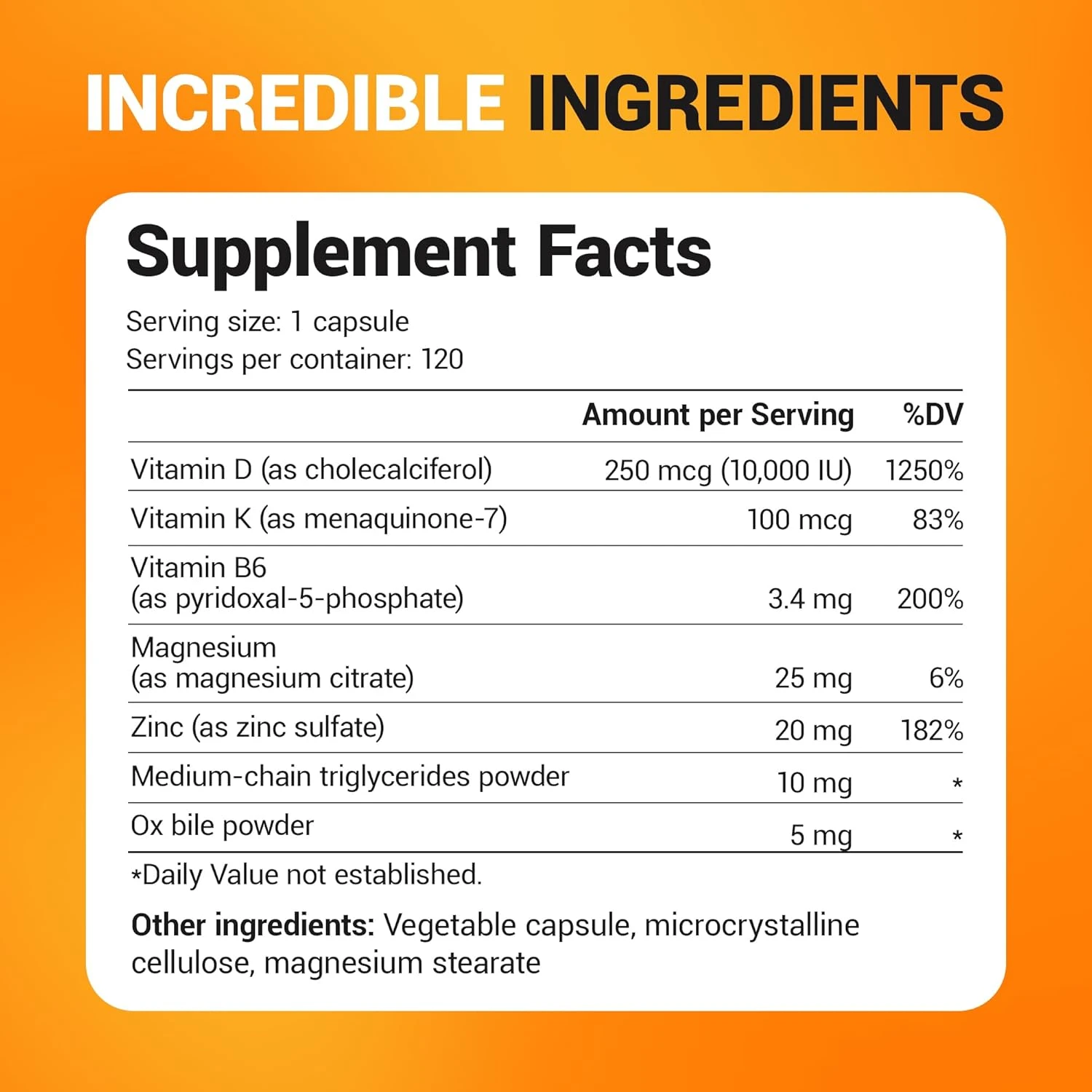 يُنتجه جسمك بشكل طبيعي لتكسير الدهون وامتصاص الفيتامينات التي تذوب في الدهون. فيتامين د3 وفيتامين ك2 كلاهما من الفيتامينات التي تذوب في الدهون. تساعد أملاح الصفراء المضافة في هذه التركيبة جسمك على هضمهما بشكل طبيعي.